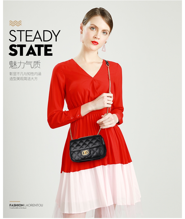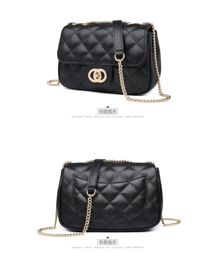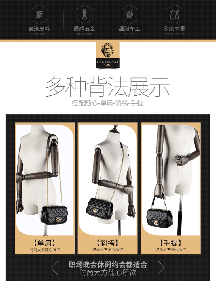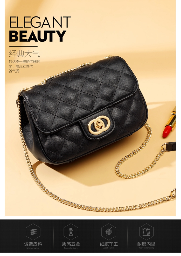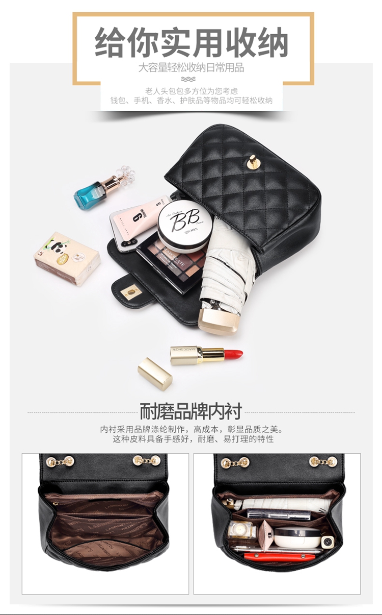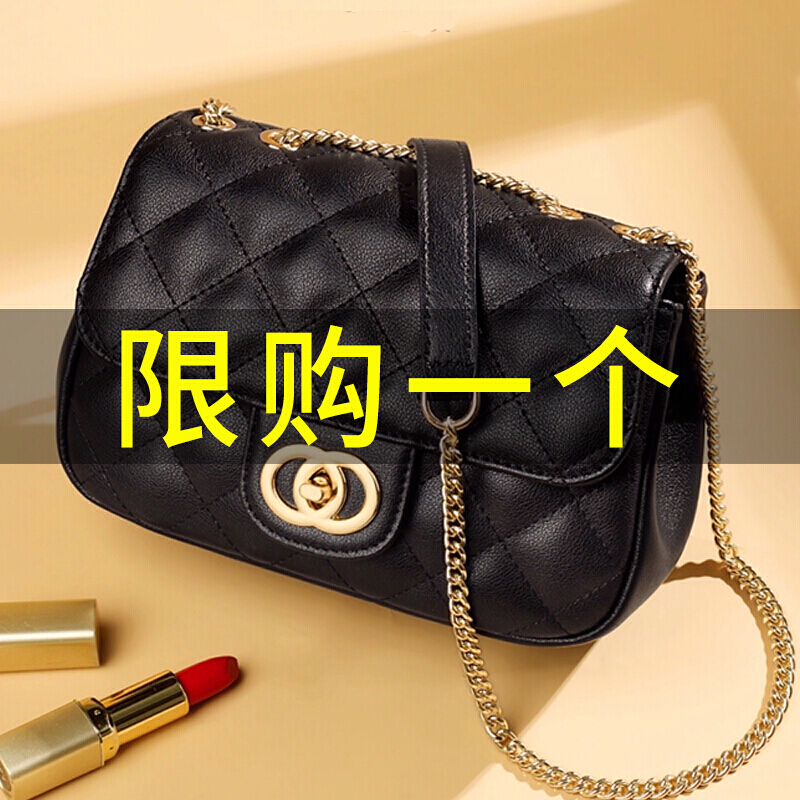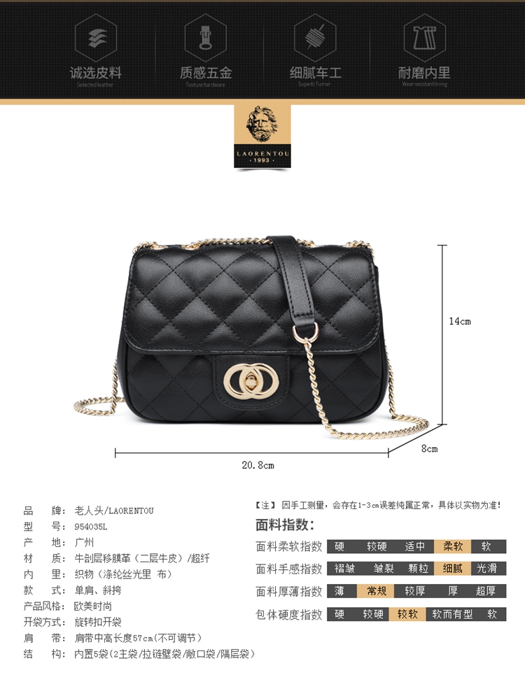 老人头(LAORENTOU)包包女包牛皮单肩斜挎包女菱格气质韩版百搭链条包小方包女黑色