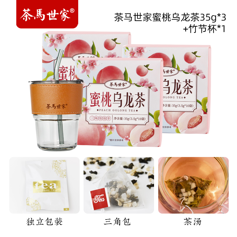 茶马世家蜜桃乌龙花果茶3盒装105g+竹节杯组合