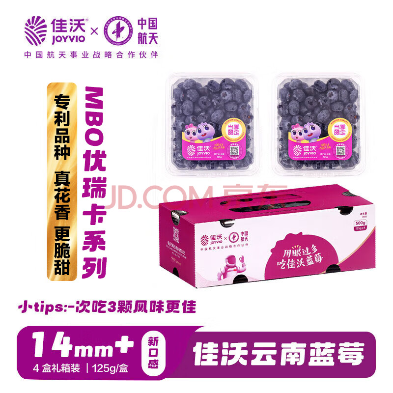 佳沃(joyvio)云南当季蓝莓MBO系列 14mm+中果 4盒礼盒装 约125g/盒 新鲜水果